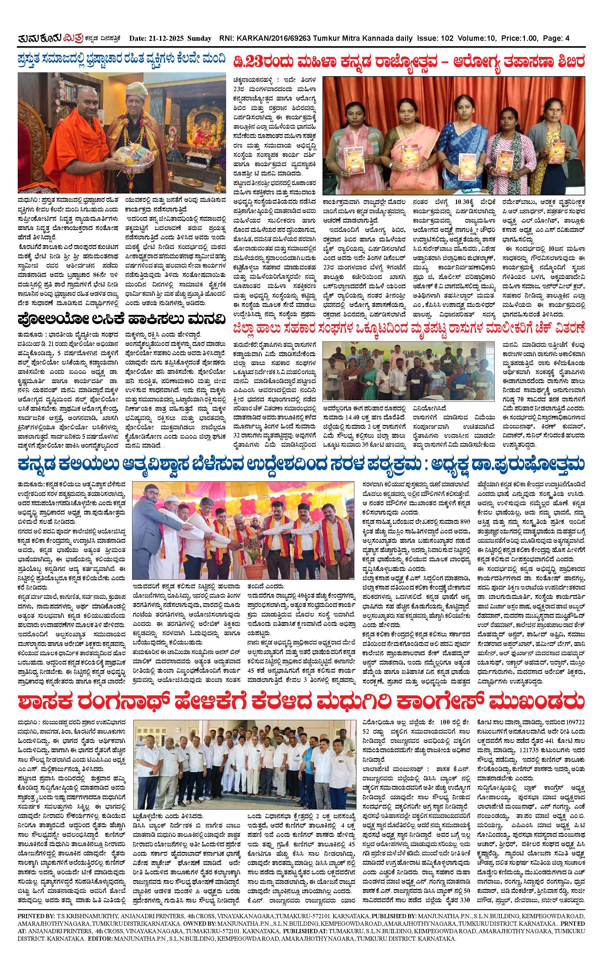 ತುಮಕೂರು ಮಿತ್ರ ಕನ್ನಡ ದಿನಪತ್ರಿಕೆ Page: 4 December 21, 2025 << First << 4 >> Last >> Page 1Page 2Page 3Page 4 × ತುಮಕೂರು ಮಿತ್ರ ಕನ್ನಡ ದಿನಪತ್ರಿಕೆ TUMKUR MITRA 21-12-25-page-001TUMKUR MITRA 21-12-25-page-002TUMKUR MITRA 21-12-25-page-003TUMKUR MITRA 21-12-25-page-004 << First << 4 >> Last >> TUMKUR MITRA 21-12-25-page-001TUMKUR MITRA 21-12-25-page-002TUMKUR MITRA 21-12-25-page-003TUMKUR MITRA 21-12-25-page-004 TUMKUR MITRA 21-12-25-page-004