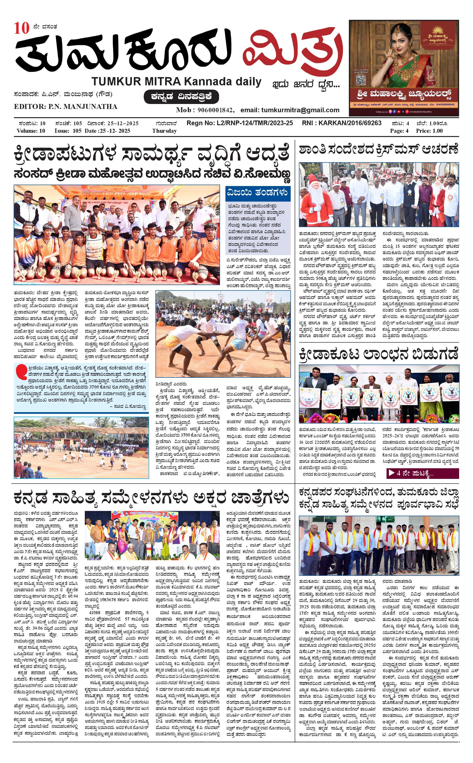ತುಮಕೂರು ಮಿತ್ರ ಕನ್ನಡ ದಿನಪತ್ರಿಕೆ December 25, 2025 << First << 1 >> Last >> Page 1Page 2Page 3Page 4 × ತುಮಕೂರು ಮಿತ್ರ ಕನ್ನಡ ದಿನಪತ್ರಿಕೆ 1-page-0012-page-0013-page-0014-page-001 << First << 1 >> Last >> 1-page-0012-page-0013-page-0014-page-001 1-page-001