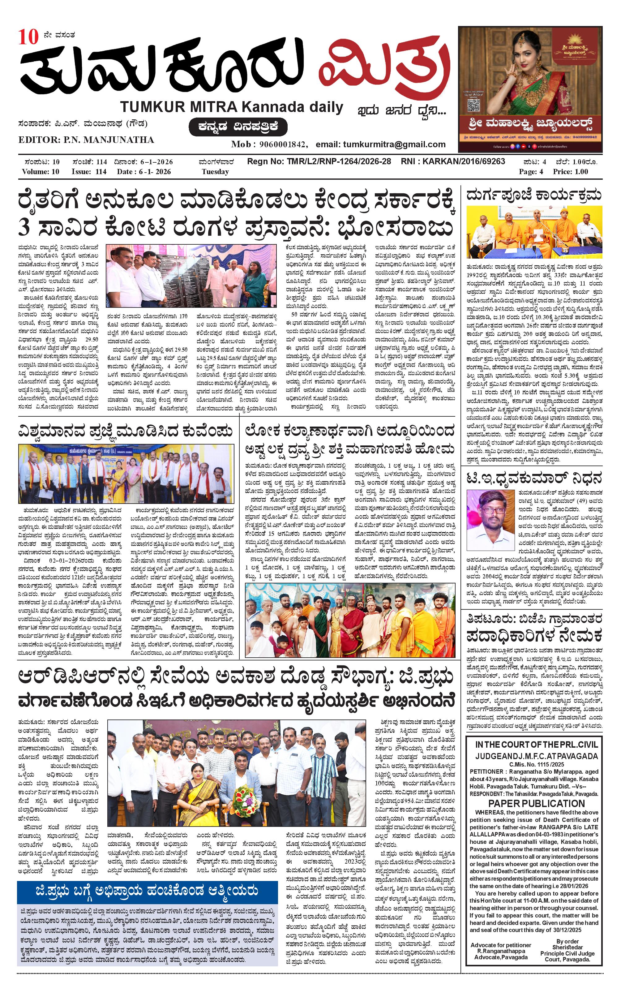 ತುಮಕೂರು ಮಿತ್ರ ಕನ್ನಡ ದಿನಪತ್ರಿಕೆ January 06, 2026 << First << 1 >> Last >> Page 1Page 2Page 3Page 4 × ತುಮಕೂರು ಮಿತ್ರ ಕನ್ನಡ ದಿನಪತ್ರಿಕೆ 1-page-0012-page-0013-page-0014-page-001 << First << 1 >> Last >> 1-page-0012-page-0013-page-0014-page-001 1-page-001