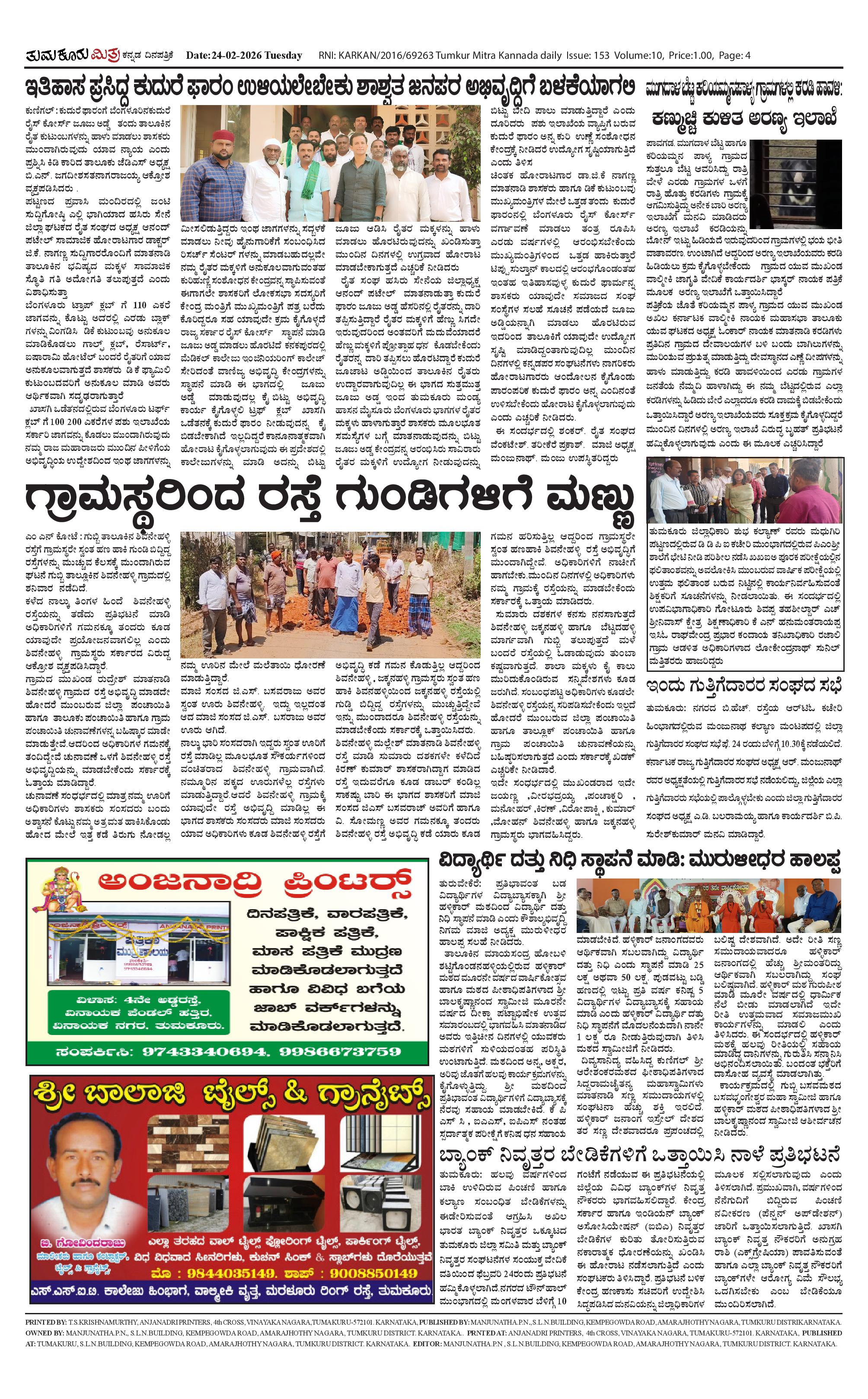 ತುಮಕೂರು ಮಿತ್ರ ಕನ್ನಡ ದಿನಪತ್ರಿಕೆ Page: 4 February 24, 2026 << First << 4 >> Last >> Page 1Page 2Page 3Page 4 × ತುಮಕೂರು ಮಿತ್ರ ಕನ್ನಡ ದಿನಪತ್ರಿಕೆ TUMKUR MITRA (1)-page-001TUMKUR MITRA (1)-page-002TUMKUR MITRA (1)-page-003TUMKUR MITRA (1)-page-004 << First << 4 >> Last >> TUMKUR MITRA (1)-page-001TUMKUR MITRA (1)-page-002TUMKUR MITRA (1)-page-003TUMKUR MITRA (1)-page-004 TUMKUR MITRA (1)-page-004