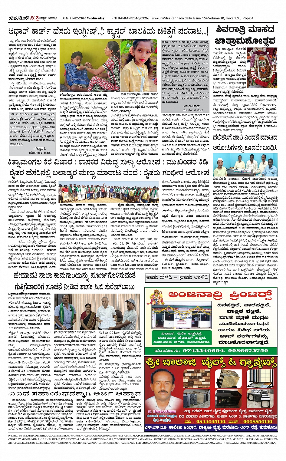 ತುಮಕೂರು ಮಿತ್ರ ಕನ್ನಡ ದಿನಪತ್ರಿಕೆ Page: 4 February 25, 2026 << First << 4 >> Last >> Page 1Page 2Page 3Page 4 × ತುಮಕೂರು ಮಿತ್ರ ಕನ್ನಡ ದಿನಪತ್ರಿಕೆ TUMKUR MITRA-page-001TUMKUR MITRA-page-002TUMKUR MITRA-page-003TUMKUR MITRA-page-004 << First << 4 >> Last >> TUMKUR MITRA-page-001TUMKUR MITRA-page-002TUMKUR MITRA-page-003TUMKUR MITRA-page-004 TUMKUR MITRA-page-004