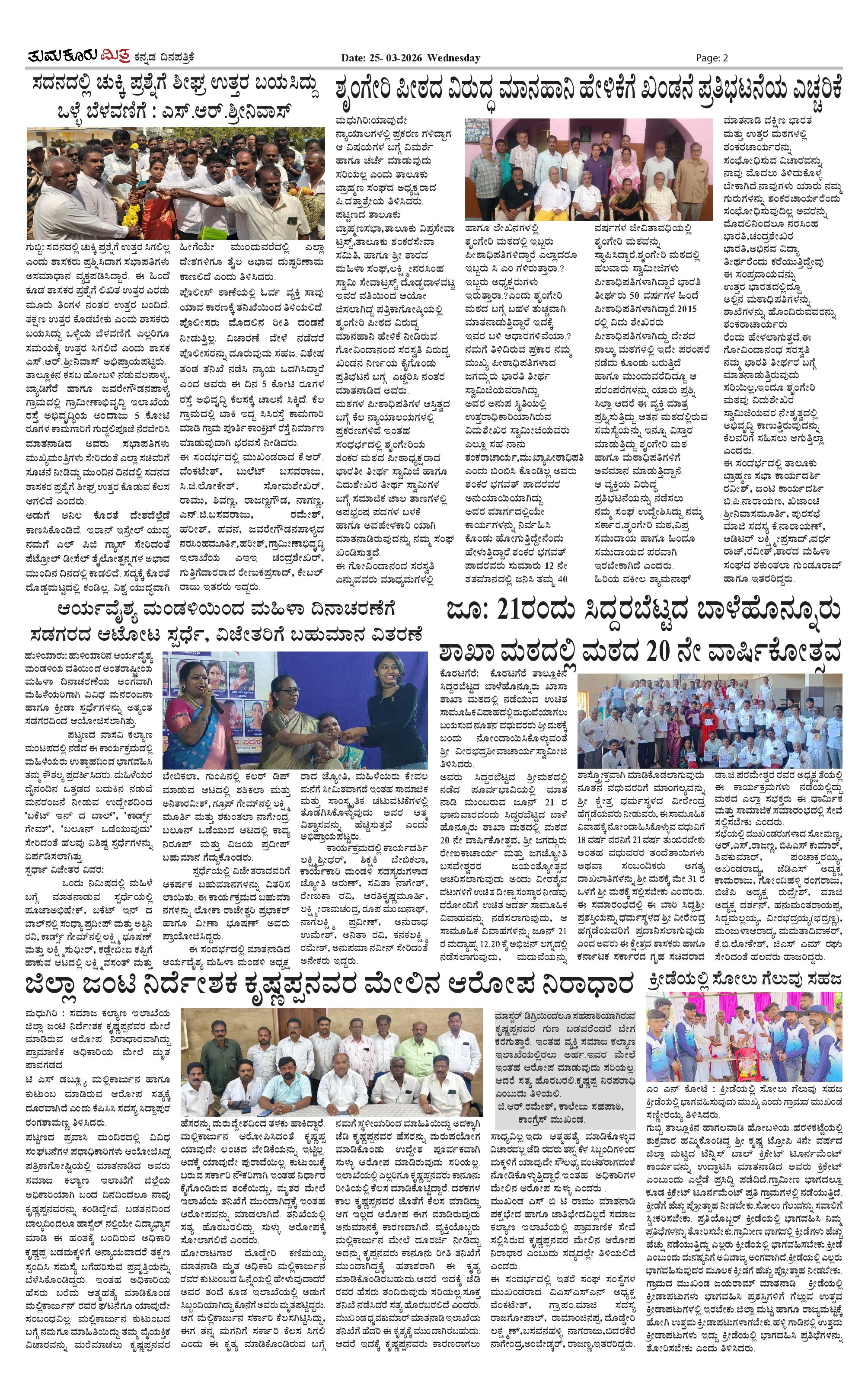 ತುಮಕೂರು ಮಿತ್ರ ಕನ್ನಡ ದಿನಪತ್ರಿಕೆ Page: 2 March 25, 2026 << First << 2 >> Last >> Page 1Page 2Page 3Page 4 × ತುಮಕೂರು ಮಿತ್ರ ಕನ್ನಡ ದಿನಪತ್ರಿಕೆ TUMKUR MITRA-page-001TUMKUR MITRA-page-002TUMKUR MITRA-page-003TUMKUR MITRA-page-004 << First << 2 >> Last >> TUMKUR MITRA-page-001TUMKUR MITRA-page-002TUMKUR MITRA-page-003TUMKUR MITRA-page-004 TUMKUR MITRA-page-002